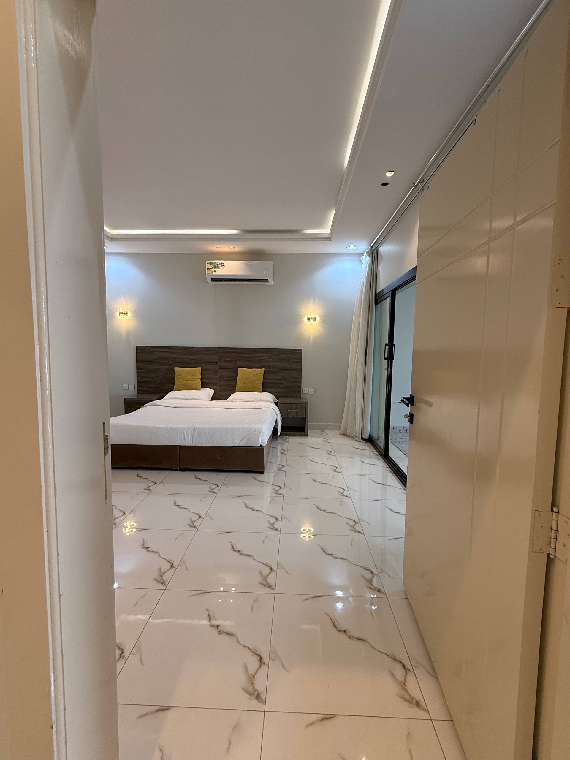 الغرفة الماستر: سرير مزدوج كبير، دولاب، تسريحة، حمامين مع حوض استحمام، وإطلالة مباشرة على المسبح الداخلي.