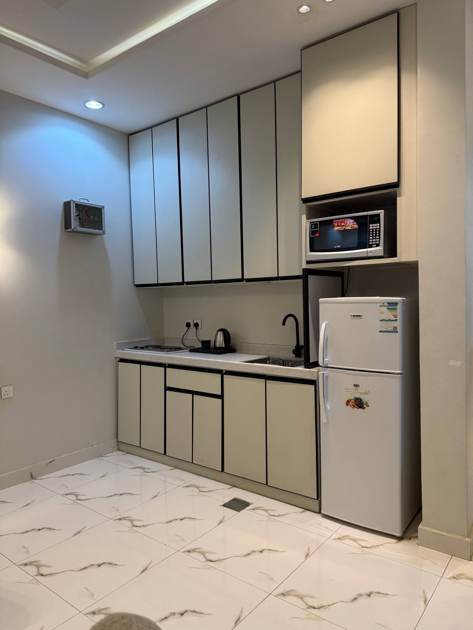 كما يضم مطبخاً صغيراً متكاملاً يحتوي على ميكروويف، موقد كهربائي، ثلاجة، وغلاية كهربائية.