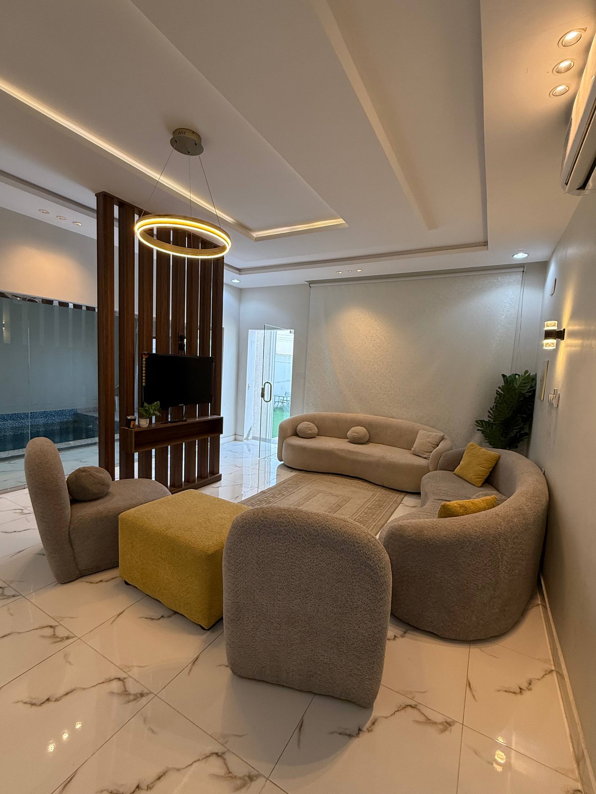بالإضافة إلى غرفة معيشة أنيقة مطلّة على المسبح مزوّدة بتلفاز وسماعات للاستمتاع بأجواء مميزة.
