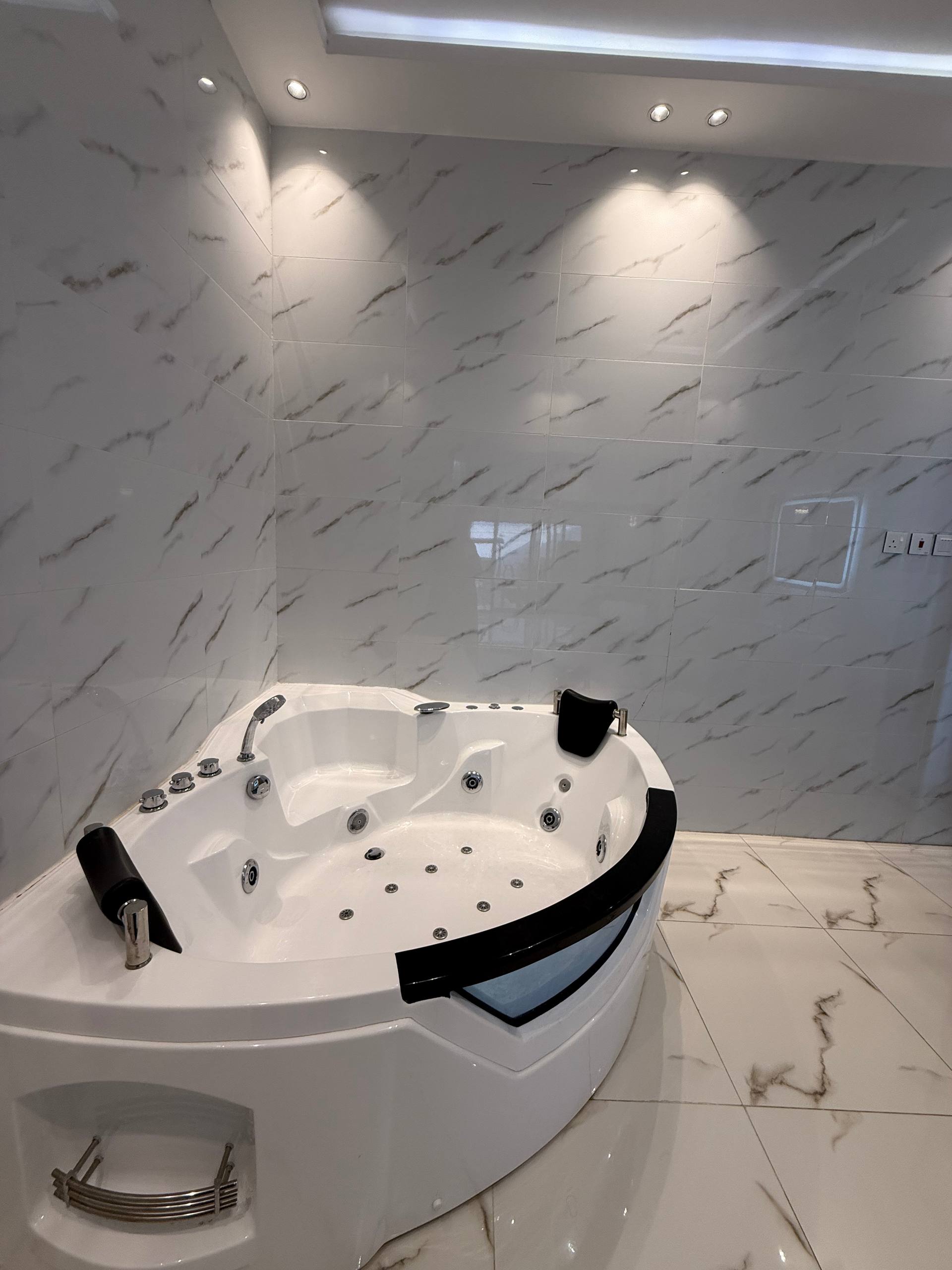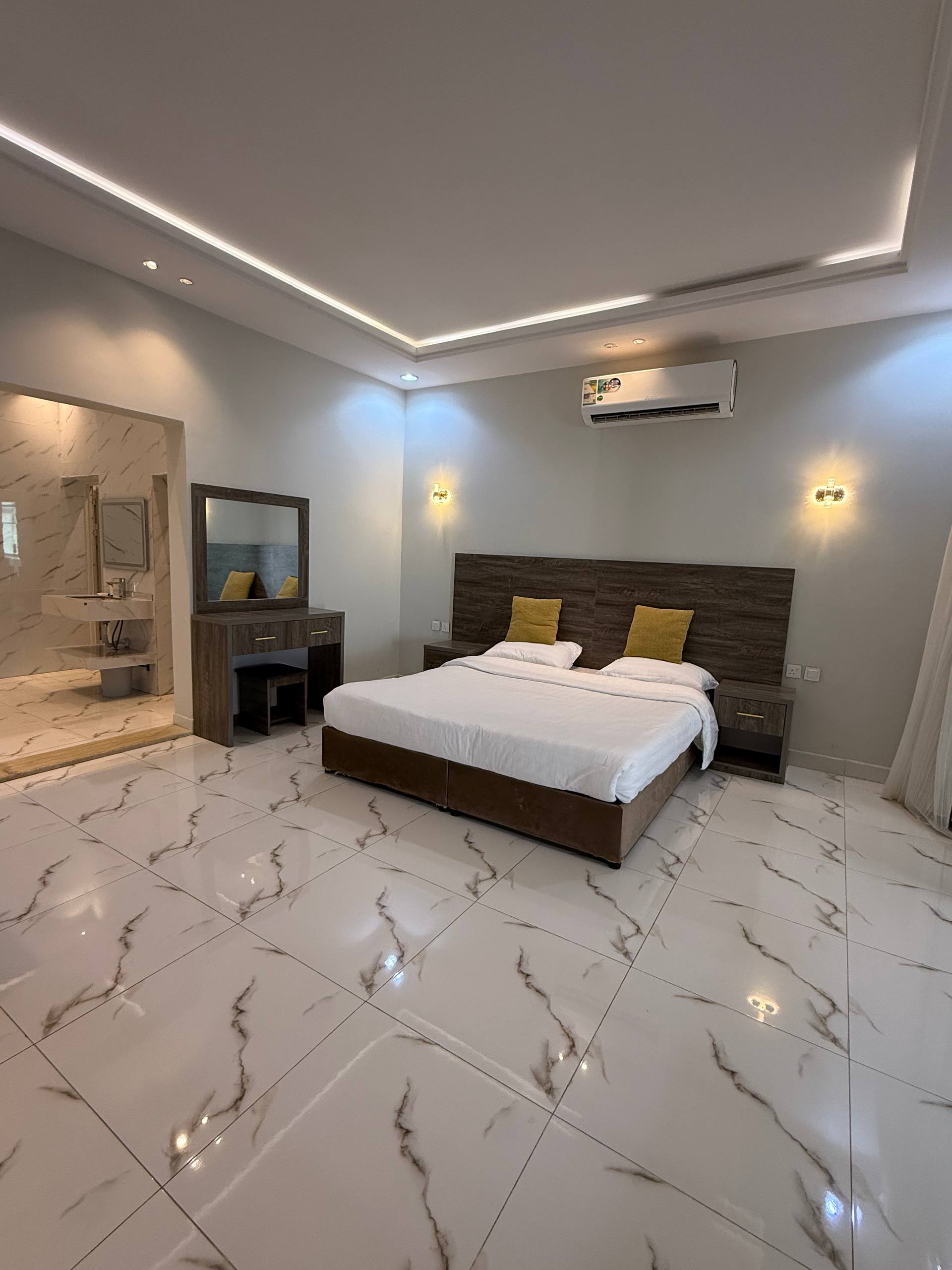 الغرفة الماستر: سرير مزدوج كبير، دولاب، تسريحة، حمامين مع حوض استحمام، وإطلالة مباشرة على المسبح الداخلي.