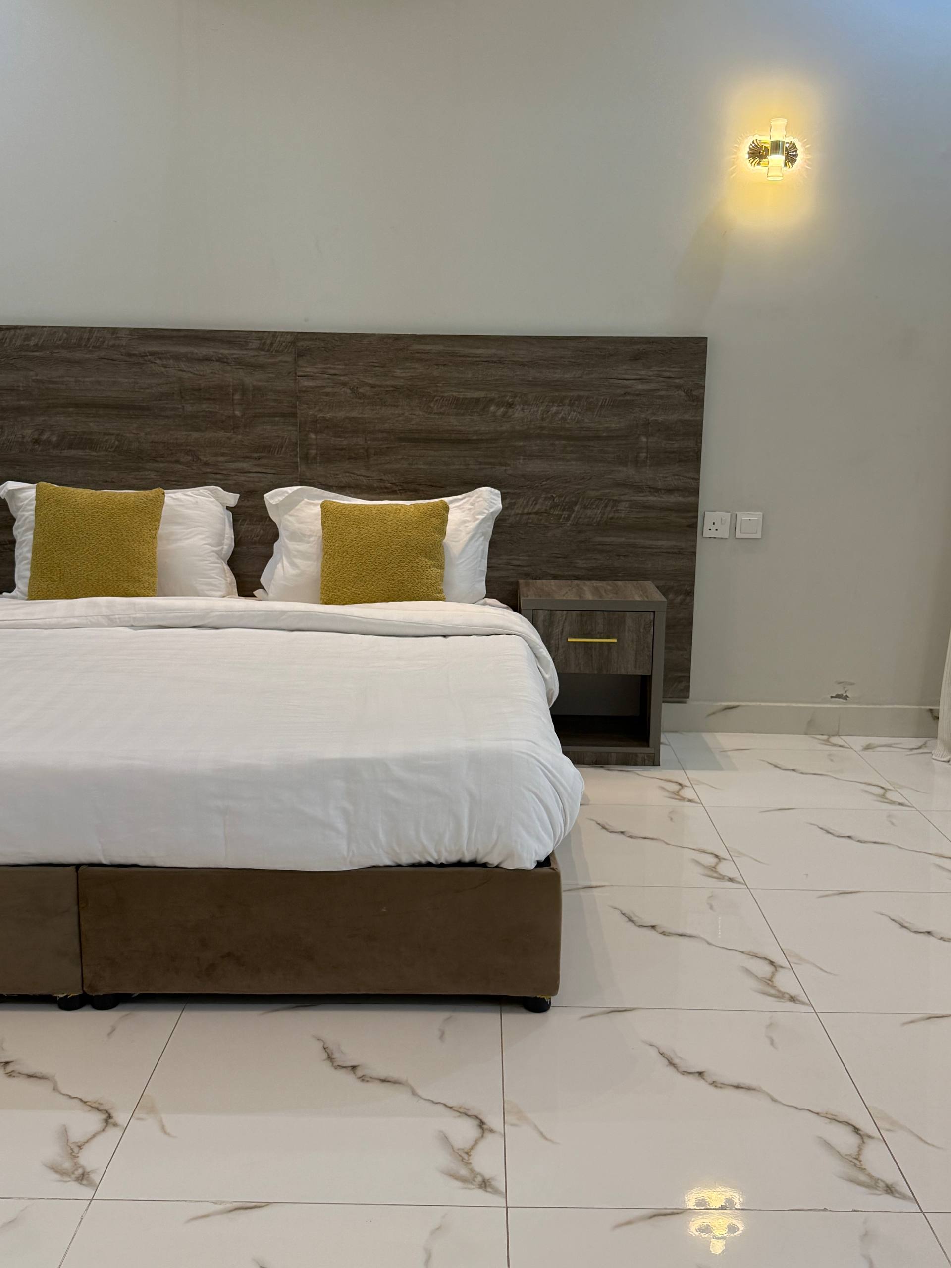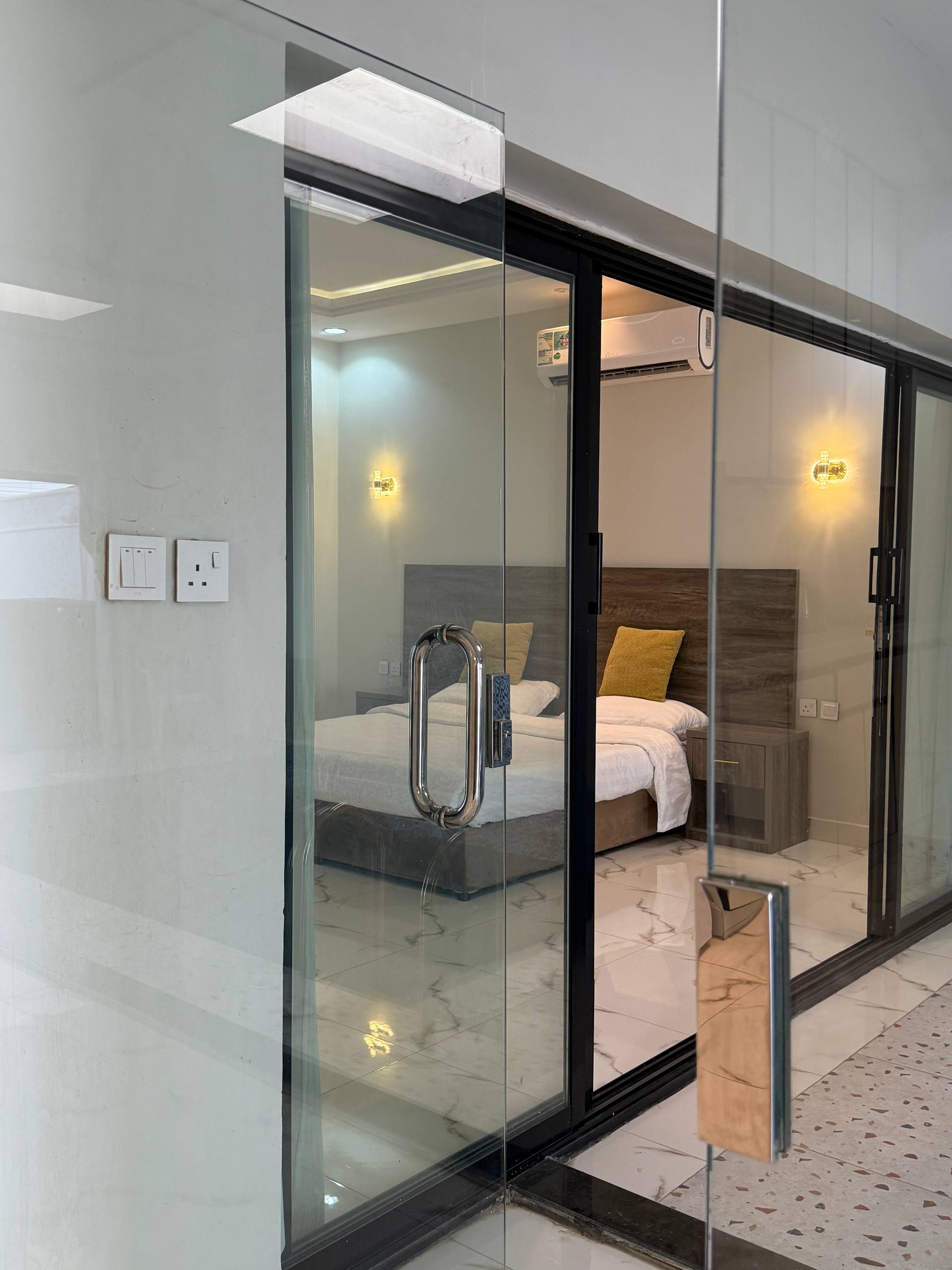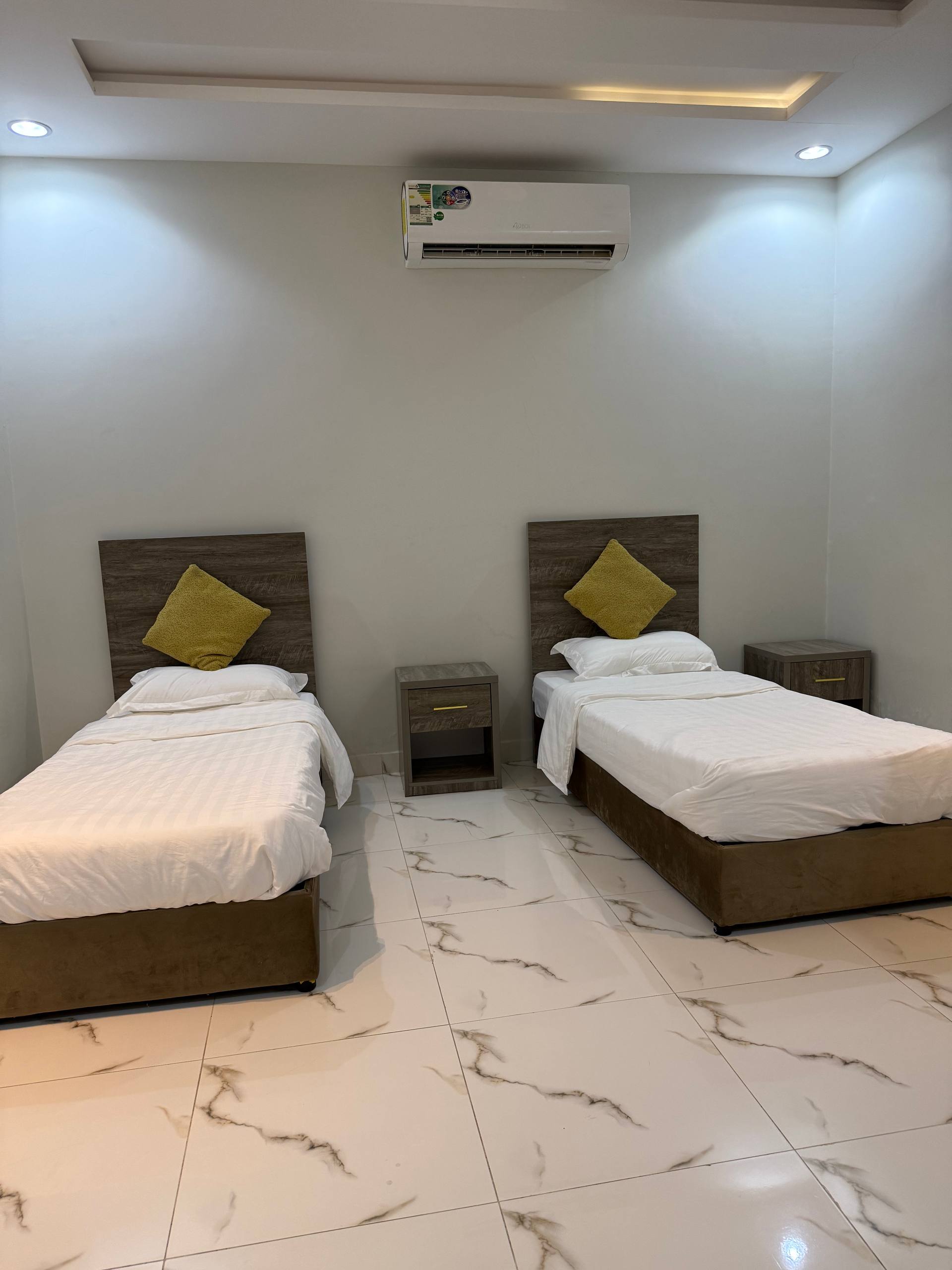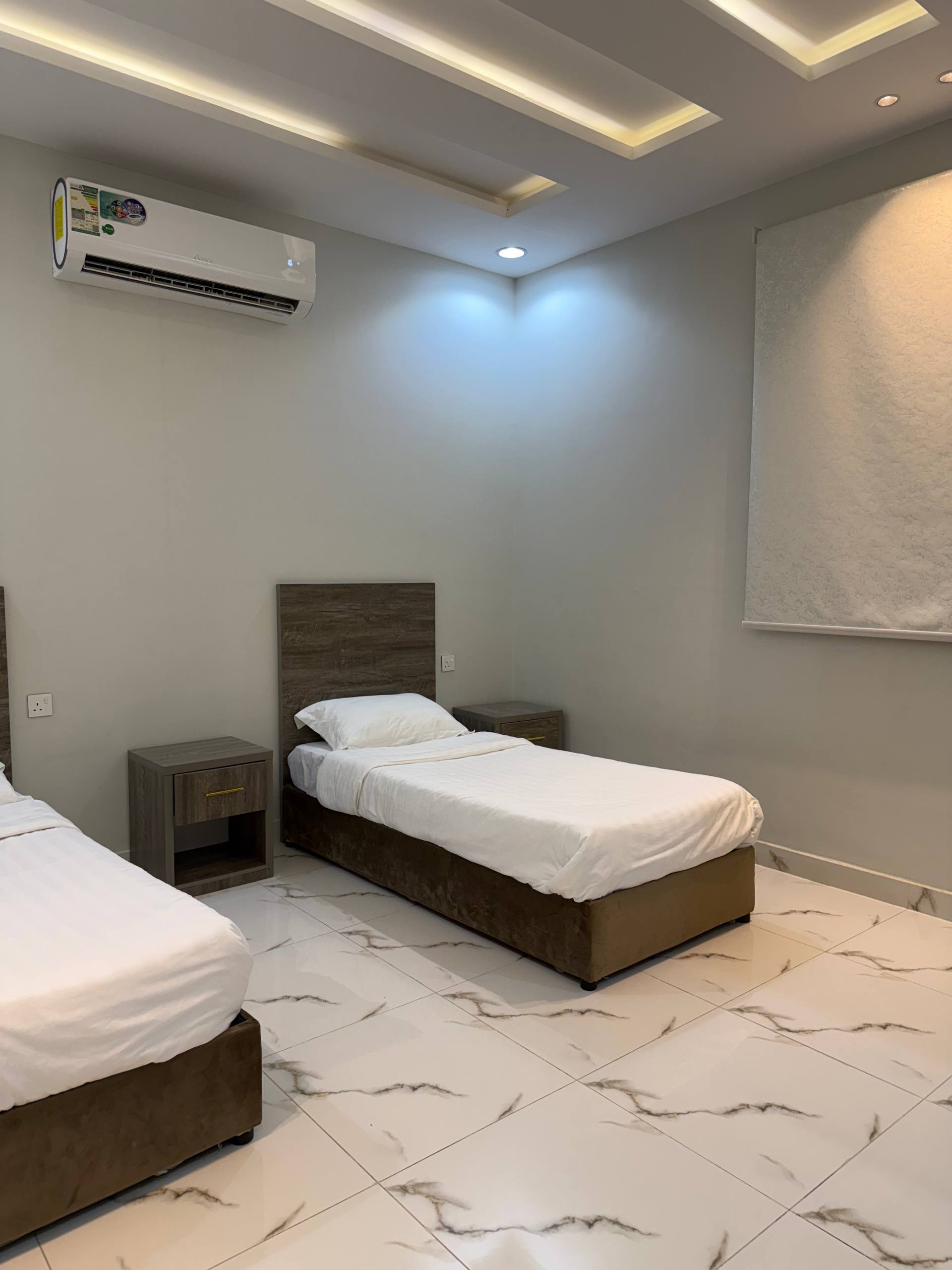 الغرفة الثانية: تحتوي على سريرين فرديين، دولاب وتسريحة، مع حمام خارجي خاص بها.