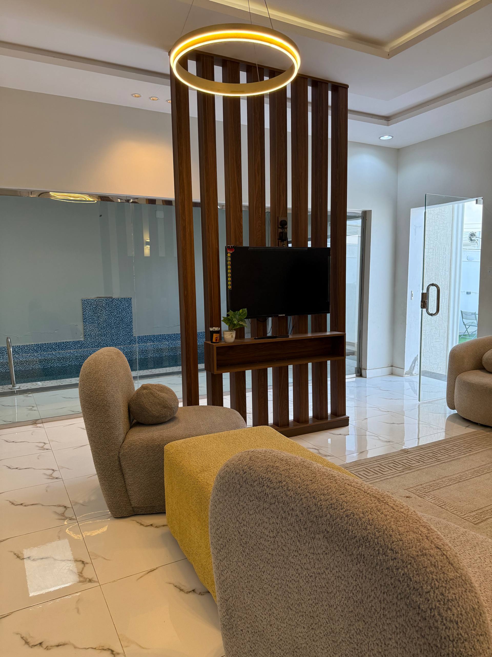 بالإضافة إلى غرفة معيشة أنيقة مطلّة على المسبح مزوّدة بتلفاز وسماعات للاستمتاع بأجواء مميزة.