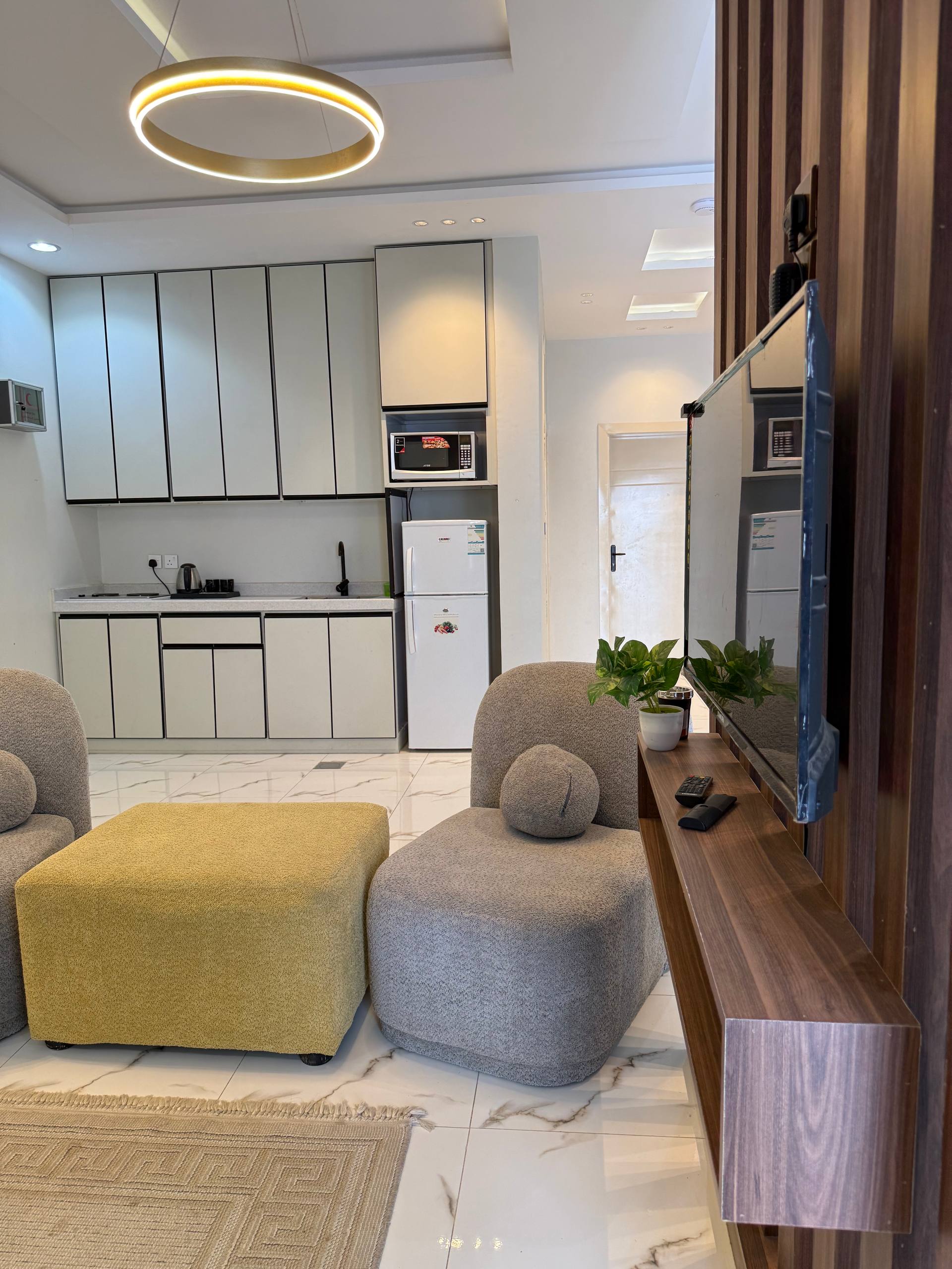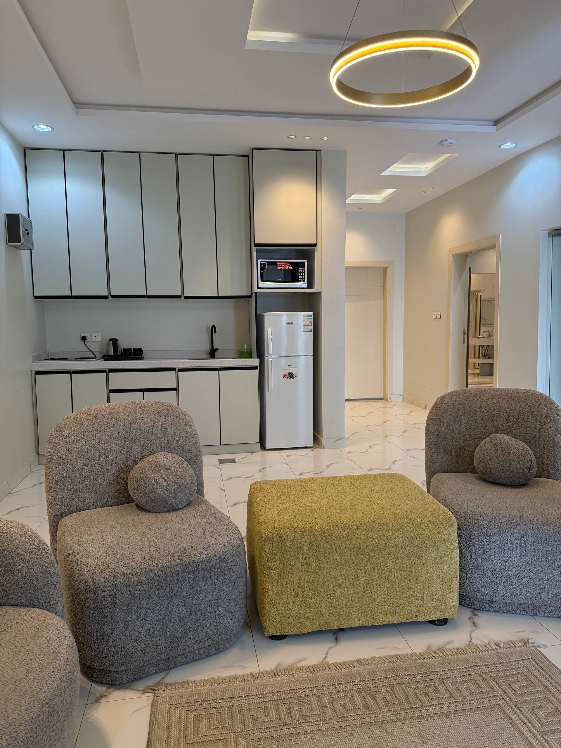 كما يضم مطبخاً صغيراً متكاملاً يحتوي على ميكروويف، موقد كهربائي، ثلاجة، وغلاية كهربائية.